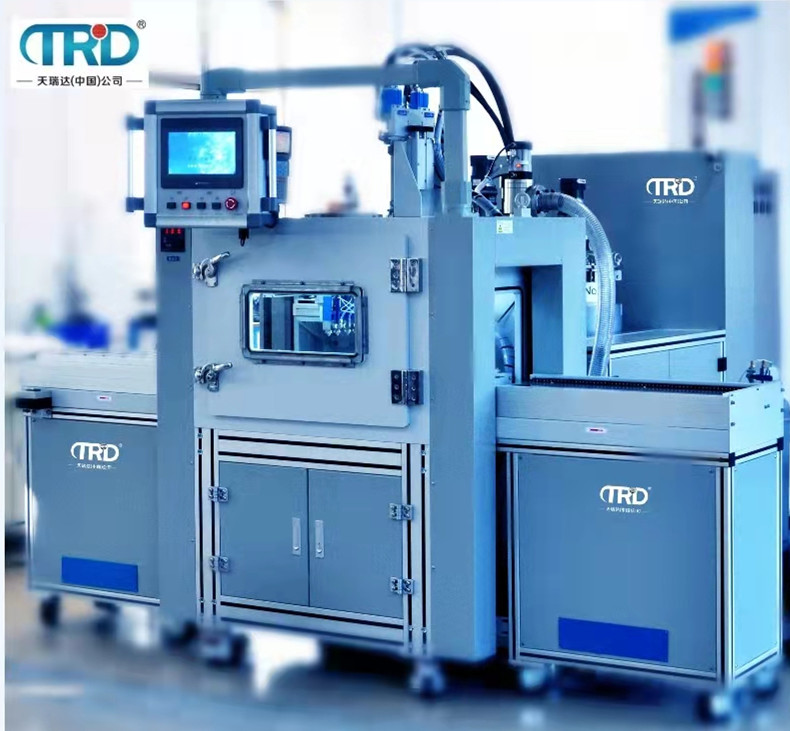 一,真空灌膠機的優勢:然而它的使用基本不受外界環境所干擾,所以設備性能穩定,注膠精度  高,運行可靠。而正是由于這些特性,相比在常壓下灌注,膠水貼度過高氣泡極難消除,產品內部有 氣泡膠水極難滲透,而導致灌出來的產品表面凹凸不平,性能更是相差甚遠。此時真空灌膠機的作用則可以體現出來,真空灌膠機是保持在絕對負壓狀態下對產品進行3-4次灌注的作業方式,利用負壓的作用力,在灌注過程中先將真空箱體內的空氣抽走,再進行產品灌注,能快速將膠水滲入到產品內部,灌注沖擊及膠水跟產品接觸產生的氣泡在負壓作用下也能快速抽走,從而保證產品的高性能。